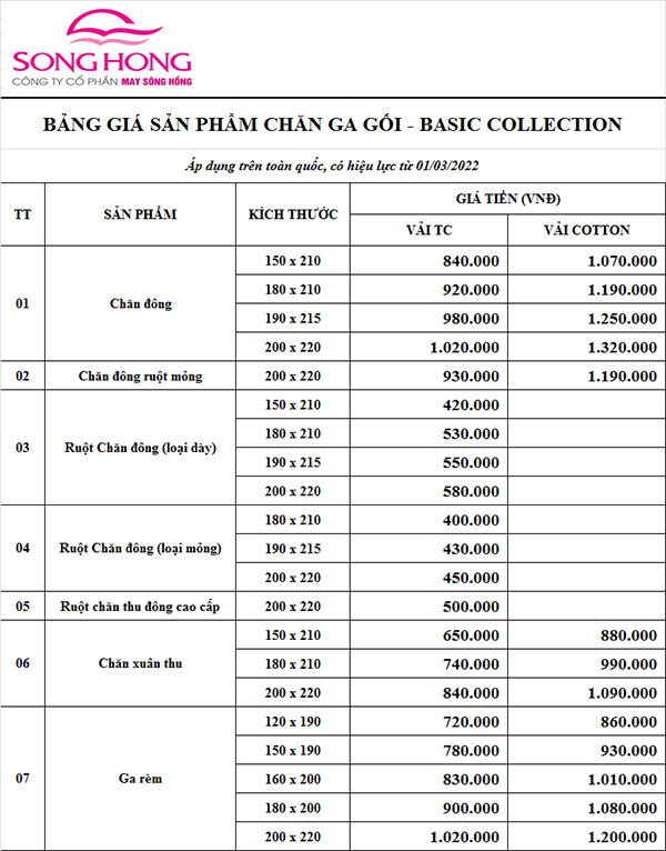 Hiện chăn ga gối đệm Sông Hồng Basic Collection đang được bày bán tại Changagoidemsonghong.online với ưu đãi lên đến 15%. Mức giá dao động từ 1.785.000-2.168.000 đồng tùy theo kích cỡ và loại ga giường.