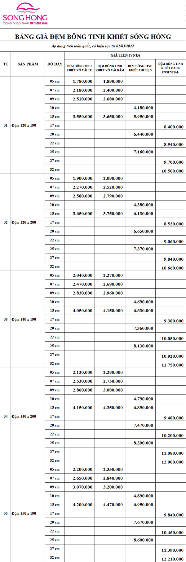 Hiện đệm bông ép tinh khiết Sông Hồng đang được bày bán tại Changagoidemsonghong.online với ưu đãi lên đến 30%. Mức giá dao động từ 1.281.000-5.845.000 đồng tùy theo mẫu sản phẩm và kích thước.