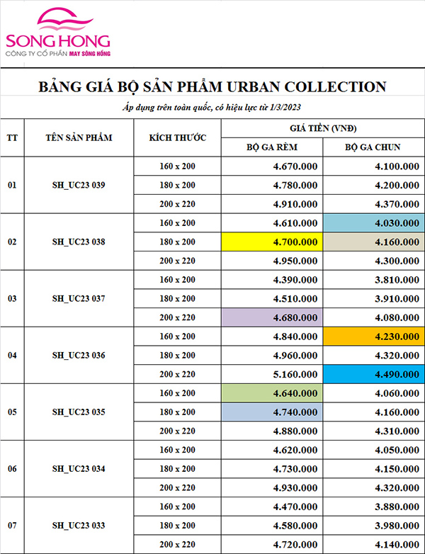 Hiện chăn ga gối đệm Sông Hồng Urban Collection đang được bày bán tại Changagoidemsonghong.online với ưu đãi lên đến 15%. Mức giá dao động từ 1.785.000-4.386.000 đồng tùy theo mẫu sản phẩm, kích thước và loại ga giường.