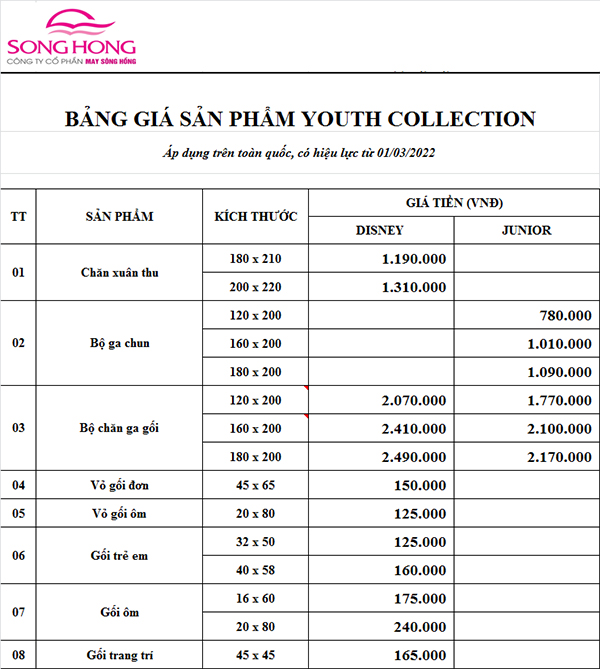 Hiện chăn ga gối đệm Sông Hồng Youth Collection đang được bày bán tại Changagoidemsonghong.online với ưu đãi lên đến 15%. Mức giá dao động từ 1.785.000-2.117.000 đồng tùy theo mẫu sản phẩm và kích thước.