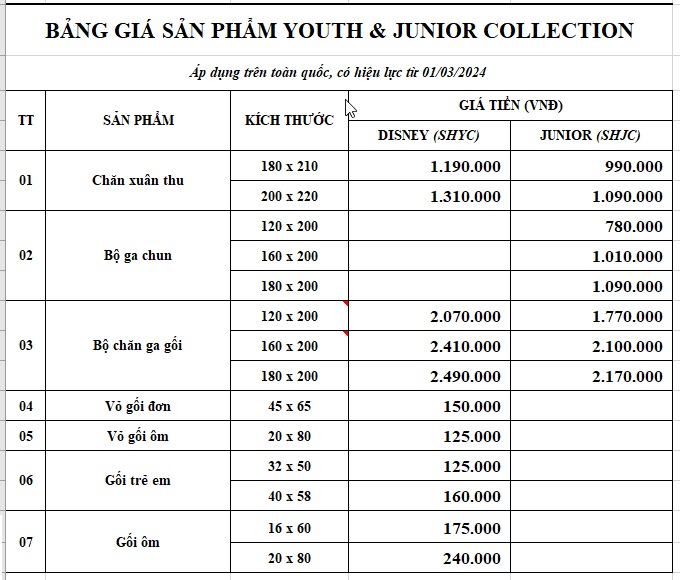 Bộ sản phẩm chăn ga gối đệm Sông Hồng Youth & Junior gồm:
