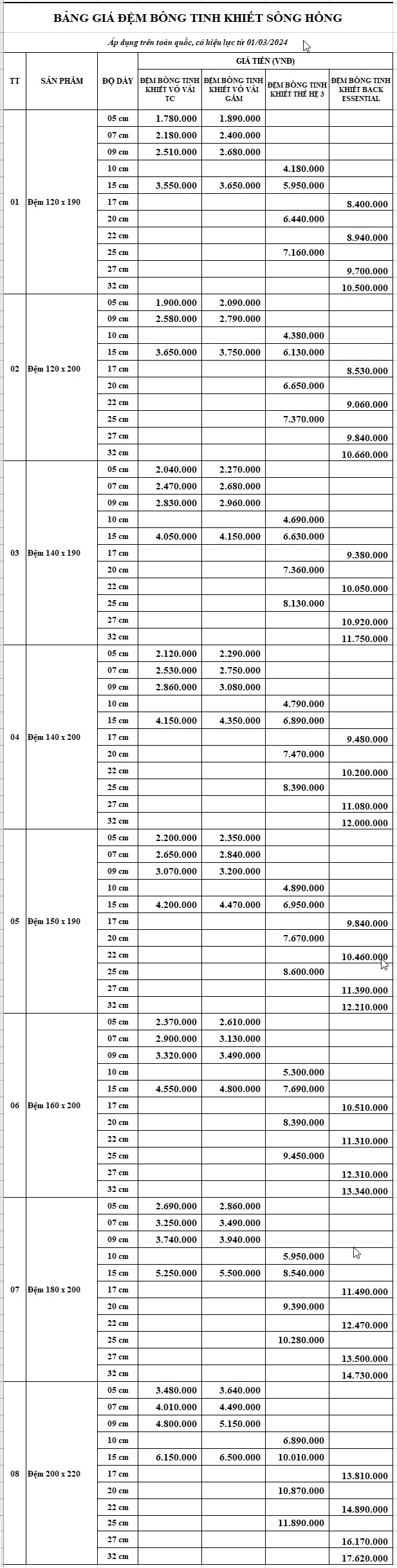 Sông Hồng đã và đang khẳng định vị thế của mình trên thị trường Việt Nam nhờ chất lượng vượt trội, thiết kế tinh tế và giá cả hợp lý. Dưới đây là bảng giá chăn ga gối đệm Sông Hồng 2024-2025 giúp quý khách hàng dễ dàng lựa chọn và tìm kiếm sản phẩm phù hợp với nhu cầu của mình.