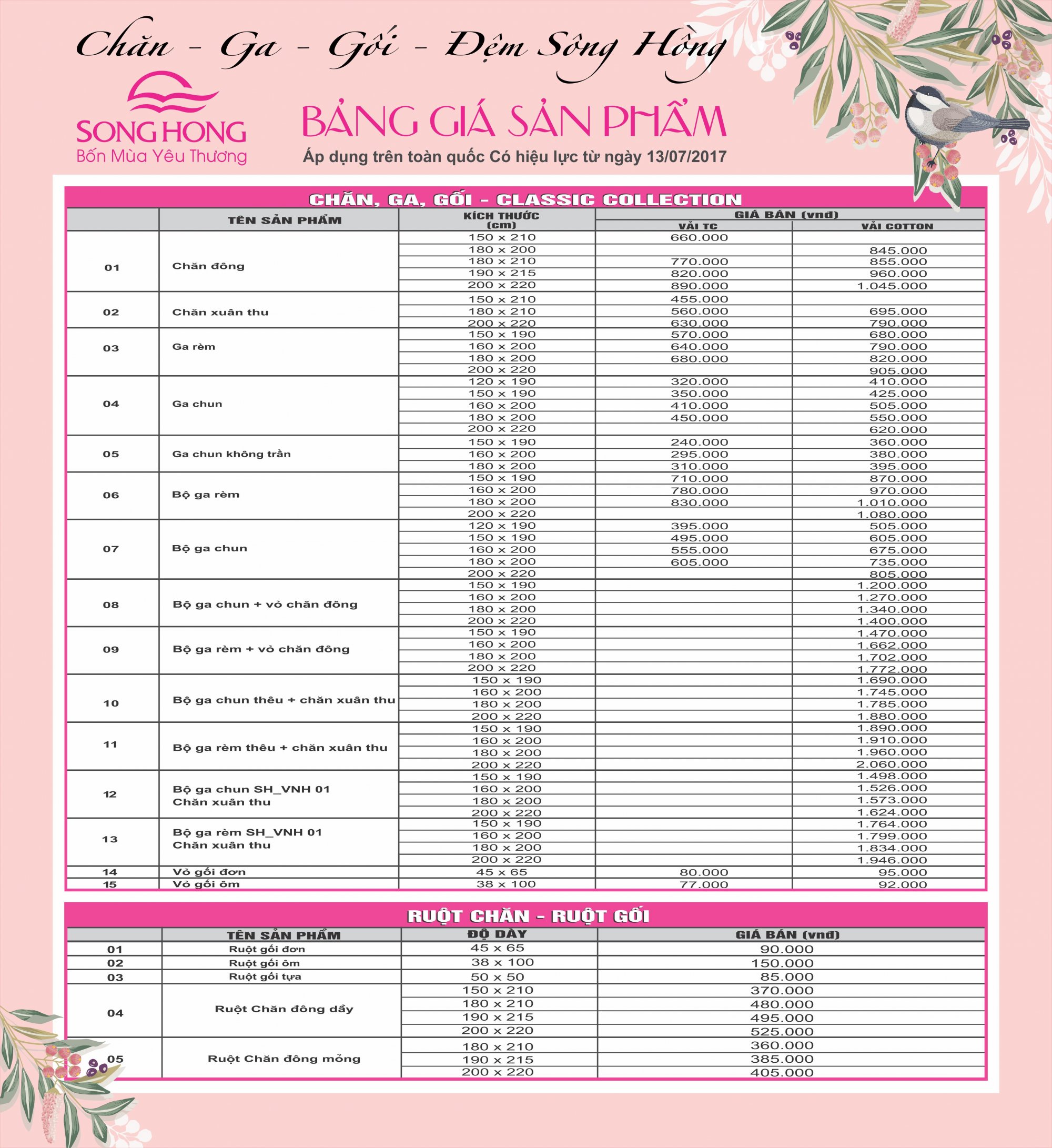 Bạn đang cần chọn mua chăn ga gối Sông Hồng giá rẻ nhưng không biết đâu mới là lựa chọn thích hợp. Dưới đây là một số thông tin về bảng giá chăn ga gối Sông Hồng Classic, sản phẩm có giá cạnh tranh nhất của Sông Hồng. Vì thế đây chắc chắn sẽ là người bạn đồng hành với giấc ngủ và không gian của bạn.