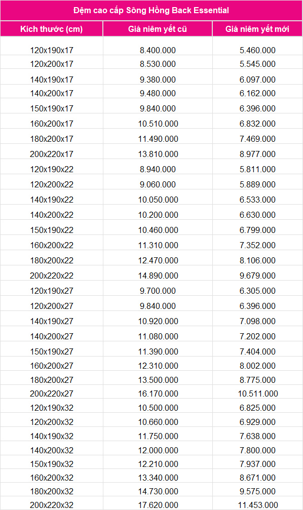 Với đặc biểm độ dày 17-22-27-32, đệm bông ép Sông Hồng Back Essential hướng tới khách hàng thích đệm cao tương tự đệm lò xo. Cấu trúc kết hợp bông ép và memory foam tạo nên bề mặt êm ái, giải tỏa căng thẳng hiệu quả. Vỏ đệm chần mềm mại, siêu thoáng khí. Đệm có khả năng chịu lực cao đạt tiêu chuẩn Mỹ với 100 nghìn lần nén liên tục, tỷ lệ phục hồi tới 98%, được chứng thực bởi công ty kiểm nghiệm uy tín nhất của Mỹ.