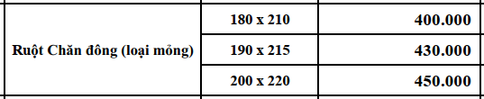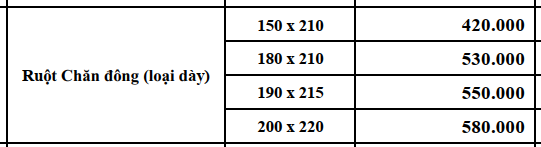 Bảng giá ruột chăn Sông Hồng loại mỏng