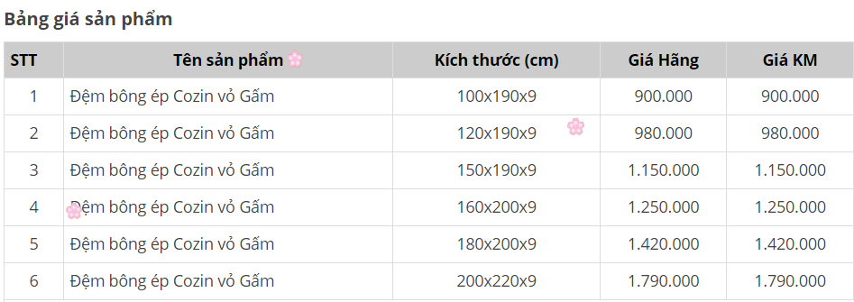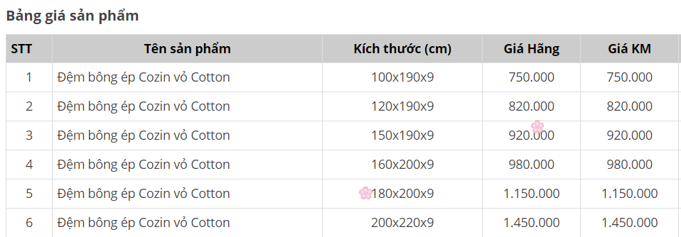 Mặc dù sản phẩm này còn được rất nhiều khách hàng ưa chuộng với mức giá thành hợp lý. Bất cứ gia đình nào dù điều kiện kinh tế kém cũng có thể sử dụng được dòng đệm bông ép Cozin này. Sản phẩm có nhiều loại từ bình dân đến cao cấp phục vụ nhu cầu sử dụng của nhiều tầng lớp khác nhau, đây chính là dòng sản phẩm mà mọi bà nội trợ tìm kiếm.