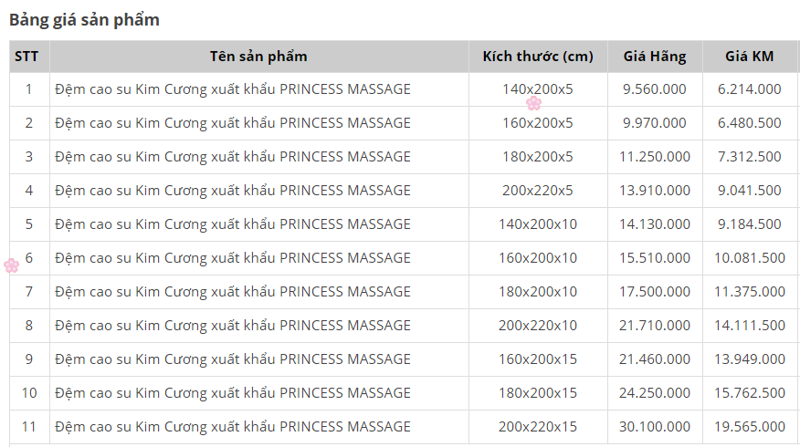 Đệm cao su thiên nhiên xuất khẩu Princess Massage được làm từ 100% cao su thiên nhiên, với hàng nghìn núm tròn nhỏ được phân bố đều khắp mặt trên của đệm có tác dụng massage toàn bộ cơ thể trong mọi tư thế.