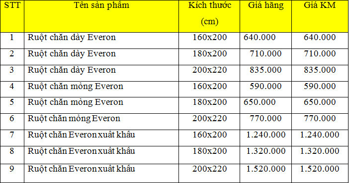 - Ruột chăn Everon có 3 loại : ruột chăn dày, ruột chăn mỏng và ruột chăn xuất khẩu