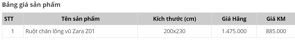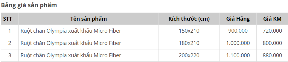 Ngoài ra ruột chăn có nhiều kích thước nhằm đáp ứng nhu cầu tốt nhất cho người tiêu dùng