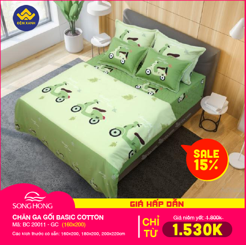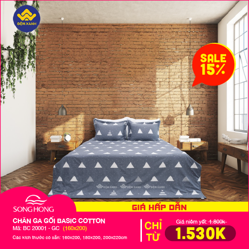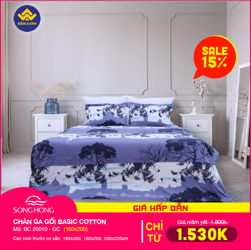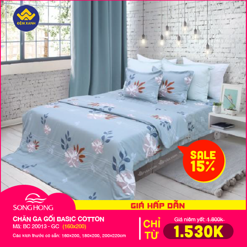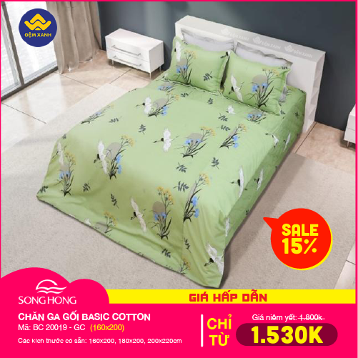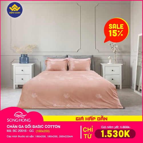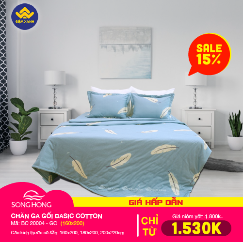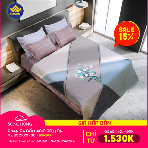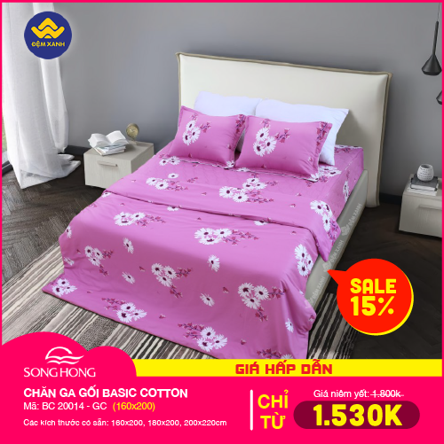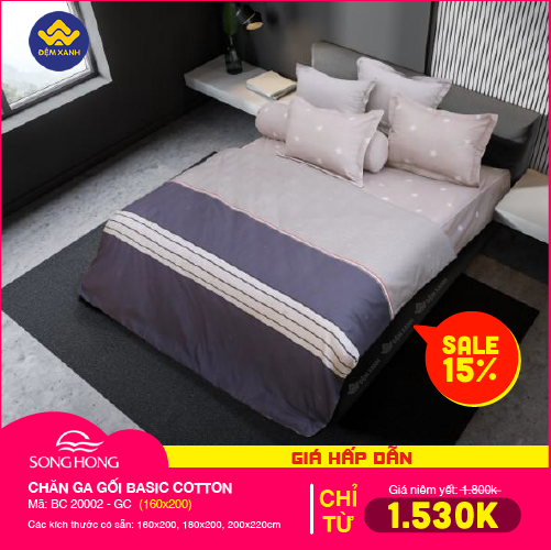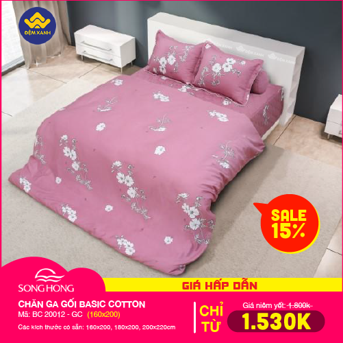 39.Bộ chăn ga gối Sông hồng Basic Cotton BC200014(Ga chun)
