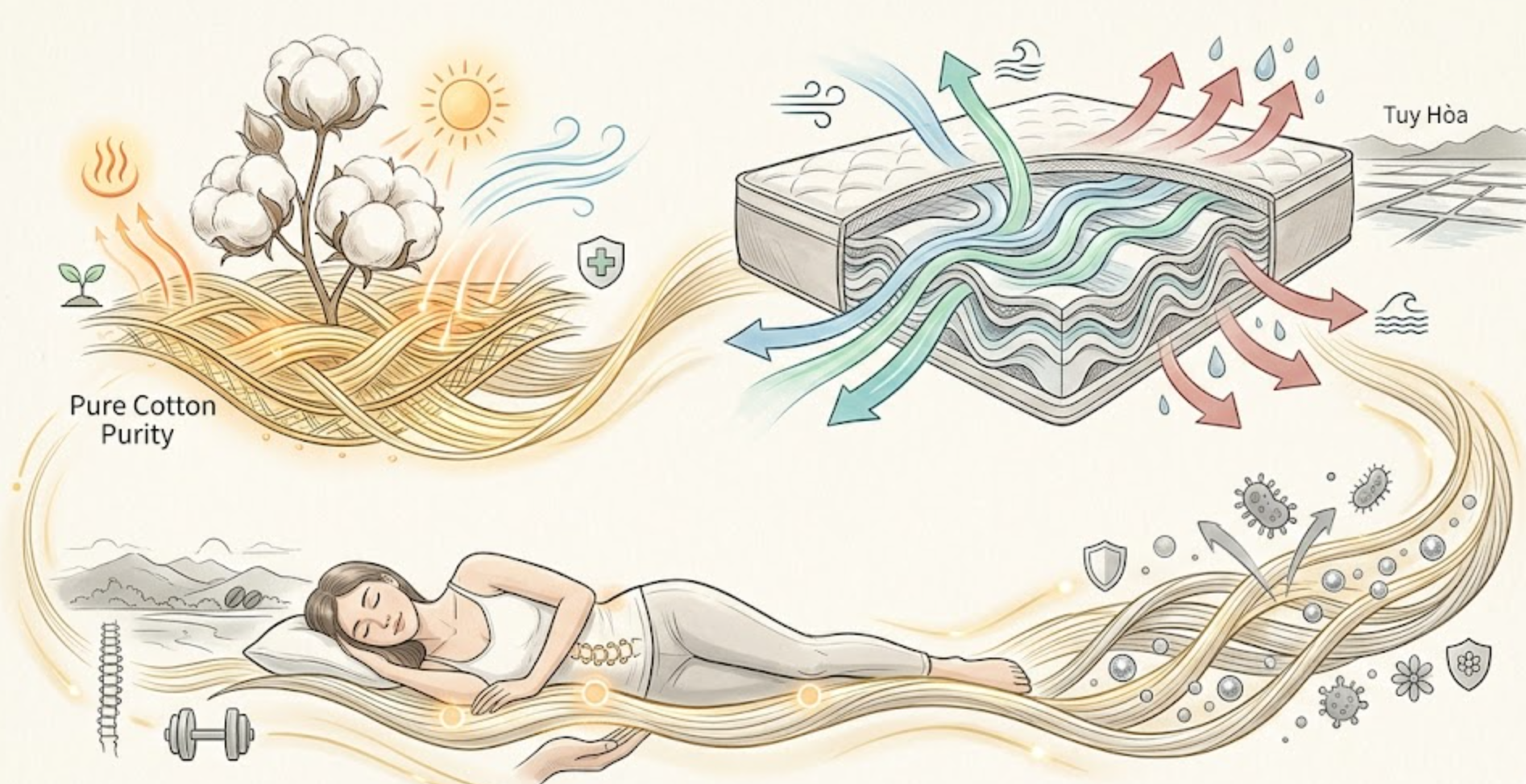 100% Cotton thiên nhiên: Được dệt từ sợi bông nguyên bản, sản phẩm sở hữu khả năng "thở" cực tốt, giúp bề mặt giường luôn khô ráo, đặc biệt phù hợp với khí hậu nóng ẩm tại Việt Nam.