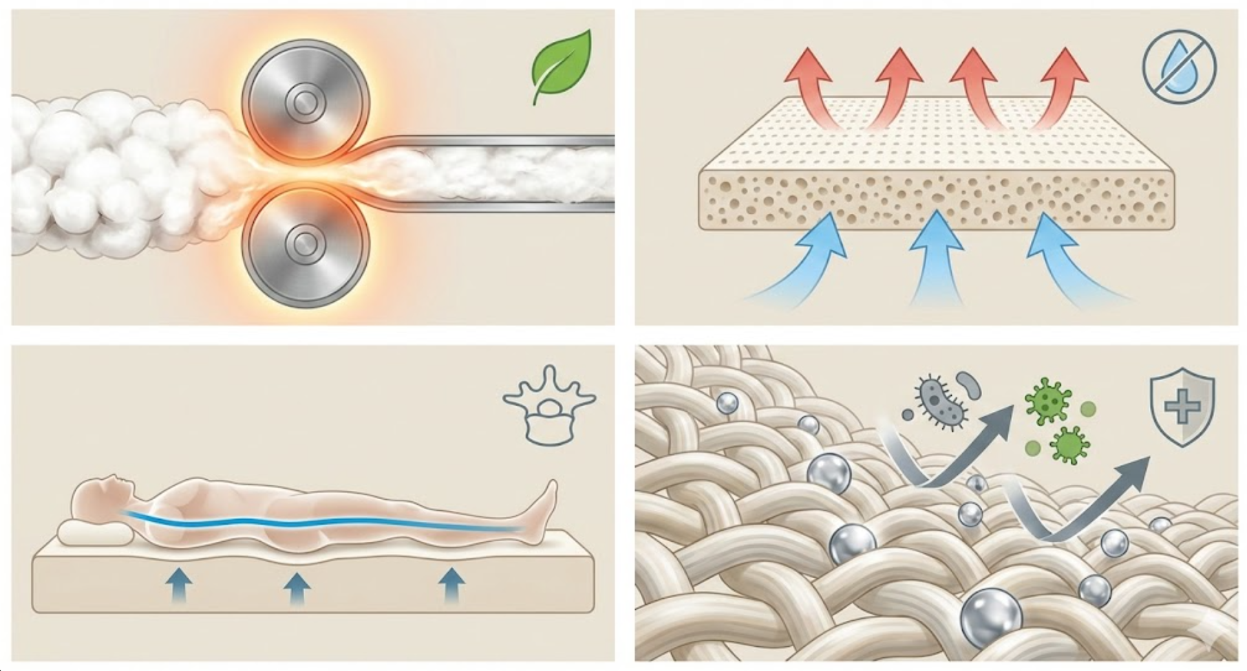 Công nghệ ép nhiệt tinh khiết: Lõi đệm được tạo thành từ hàng ngàn lớp bông tinh khiết, ép nhiệt theo tiêu chuẩn Nhật Bản. Đệm có độ phẳng cao, không gây võng lưng, hỗ trợ cực tốt cho người bị đau cột sống hoặc trẻ em đang tuổi phát triển.