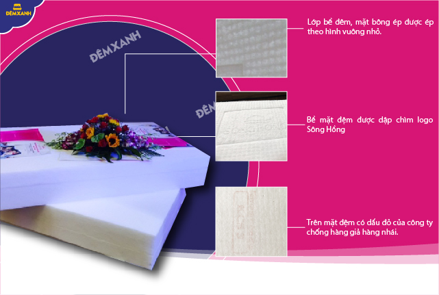 + lớp bông kháng khuẩn, không hóa chất, thân thiện với môi trường, trên bề mặt còn được thiết kế dập nổi logo Sông Hồng, cũng là điểm nhận biết hàng thật .