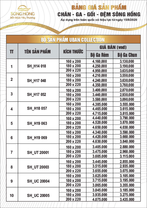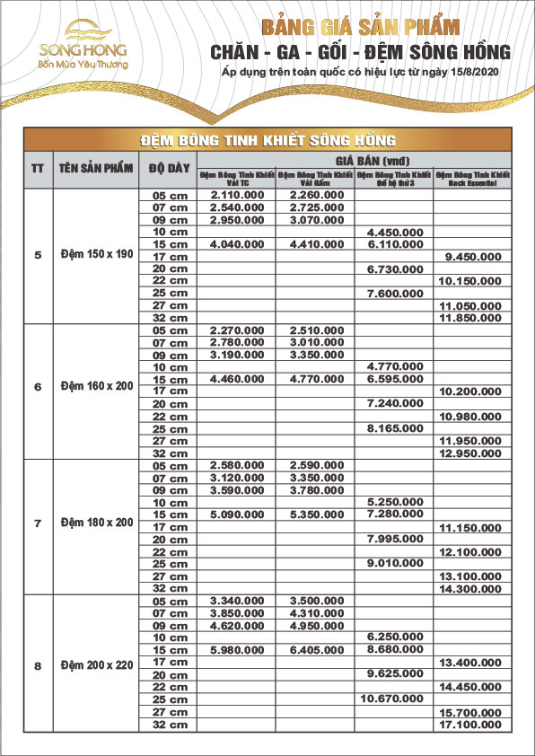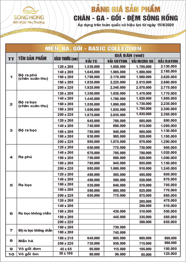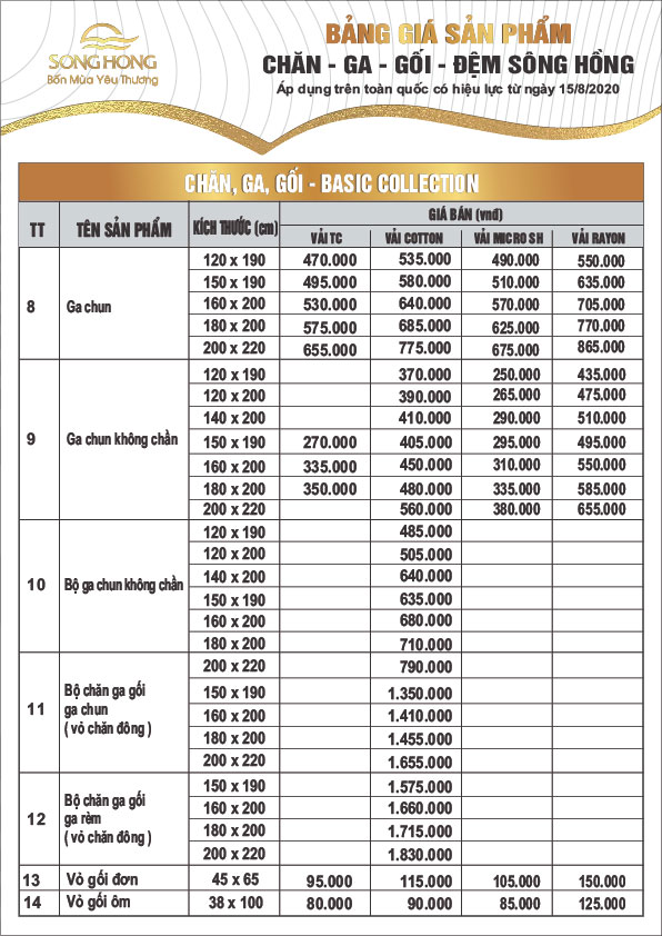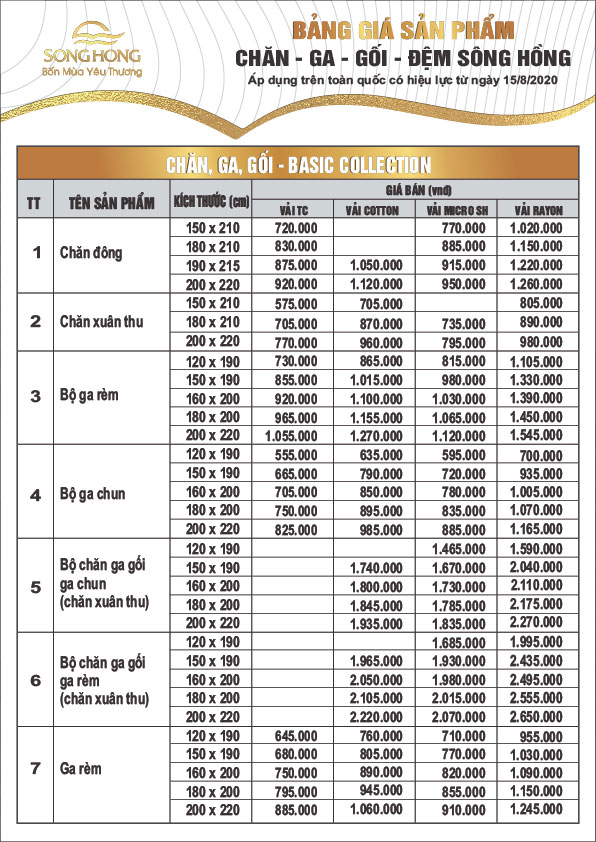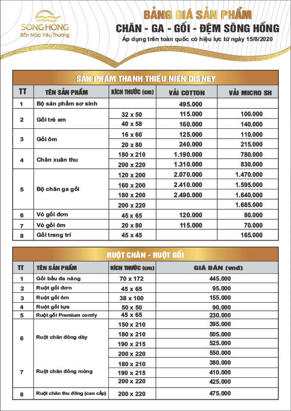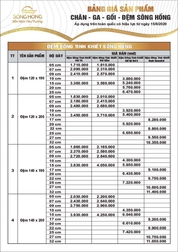 Trong mọi quá trình mua sắm, giá cả luôn là yếu tố mang tính quyết định trong thành công giao dịch. Cùng tham khảo bảng giá chăn ga gối đệm Sông Hồng dưới đây để có được lựa chọn chuẩn xác nhất.