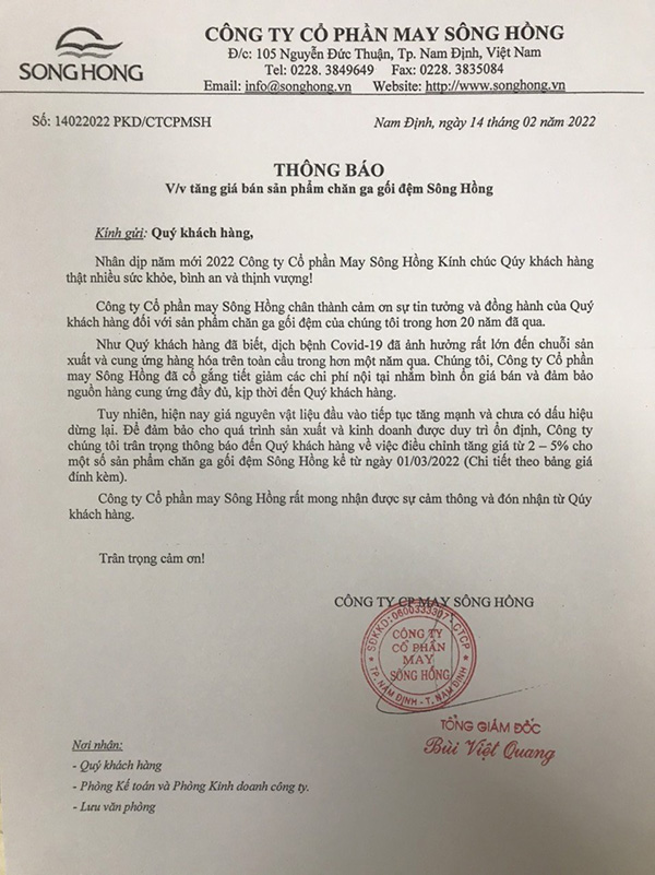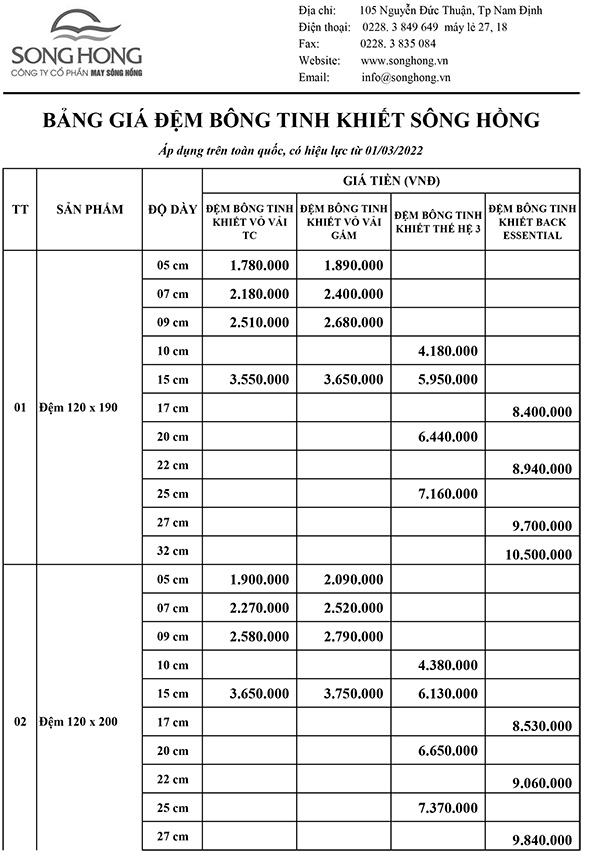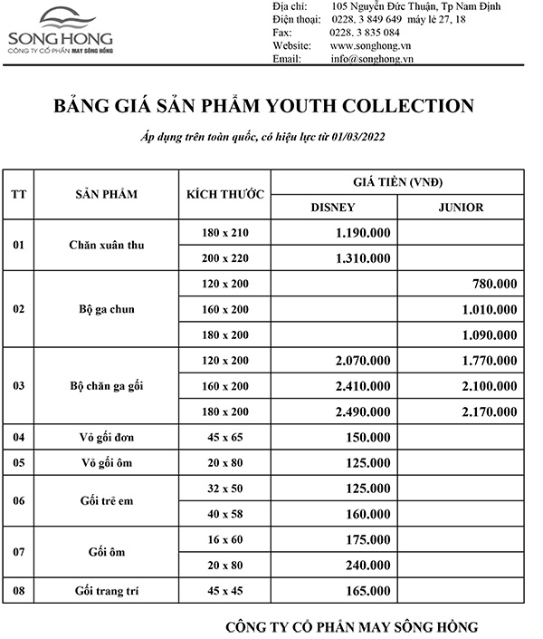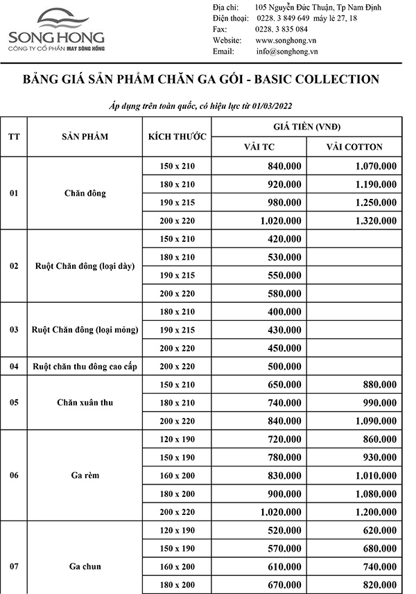 Để đảm bảo quá trình mua sắm của quý khách hàng được thuận lợi, Công ty Cổ phần May Sông Hồng trân trọng thông báo về việc điều chỉnh bảng giá sản phẩm chăn ga gối đệm Sông Hồng năm 2022.
