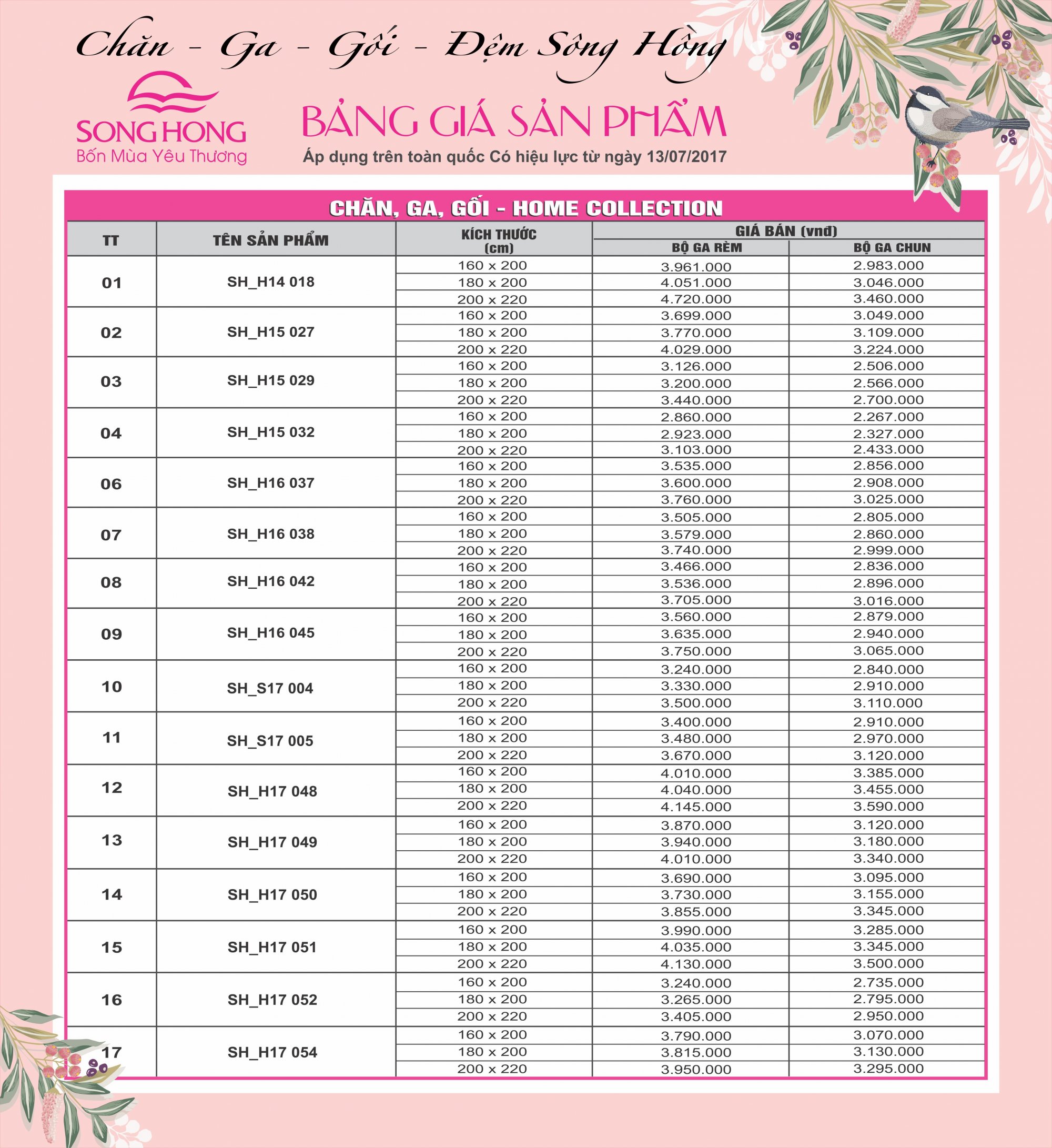 Cùng tham khảo thêm bảng giá chăn ga gối Sông Hồng Celegance mới nhất 2020 dưới đây nhé.