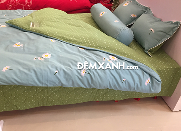 Sản phẩm chăn ga gối này với họa tiết đơn sắc là màu xanh hoàng hôn, đây là chủ đạo nhất. Những sản phẩm này được điểm tô thêm bằng những hình thêu đóa hoa tươi thắm trên nền vải Cotton cao cấp nhập khẩu 100%. Vì thế mà người tiêu dùng mỗi khi sử dụng sẽ có cảm giác như đang sống giữa một không gian thiên xanh mát.