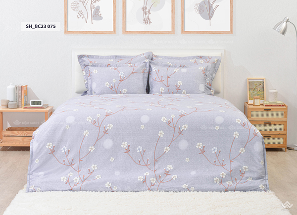 BC23075 sử dụng tông màu xám ghi nhã nhặn mang đến sự thanh lịch và hiện đại cho không gian ngủ. Đặc biệt, sự xuất hiện họa tiết nhành hoa đào với những bông hoa trắng tinh khôi tạo nên sự hài hòa mềm mại, vừa nhẹ nhàng vừa cuốn hút.